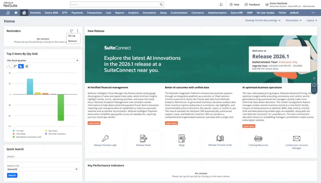 - Use role-based dashboards. Don’t make everyone “learn NetSuite.” Put the right KPIs, reminders, and searches on the dashboard for that role.