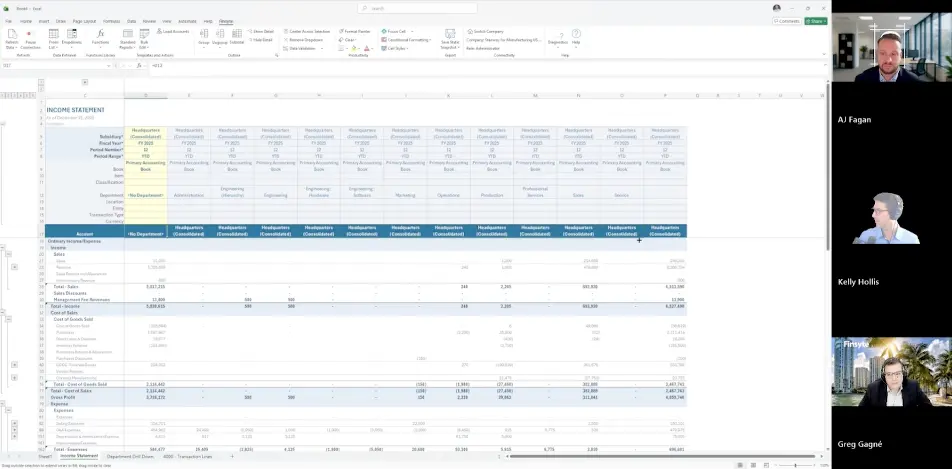 Kelly Hollis — the principal architect behind Finsyte ‘s Excel add-in — is mid-demo, building a full departmental income statement in real time. He copies a column, pastes it, changes one parameter, and suddenly the entire report recalculates across every department in the company. The whole thing takes about forty-five seconds.
