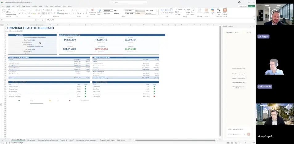 The most forward-looking piece of the demo is the AI integration. Because FinSyte functions are standard Excel functions, tools like Claude in Excel can read the data, reason about it, and write new FinSyte functions on your behalf. Kelly prompts Claude to analyze an income statement and build a board-ready financial dashboard, and what comes back is not a static snapshot but a live, parameterized template: change the reporting period and everything updates. “What it builds for me is really a template,” Kelly explains, “because it’s using my FinSyte function calls. You can continue to iterate on this and get some really powerful workbooks created quickly.”