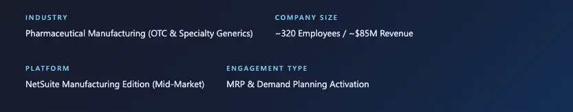 When this pharmaceutical manufacturer came to us, they were 18 months into their NetSuite go-live and running a supply chain that looked organized on the surface. The Netsuite data was largely stabilized. The modules were live. Purchase orders were moving through NetSuite. Work orders were being created.