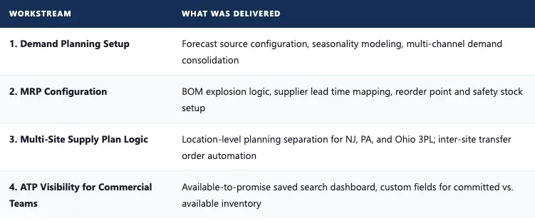 This was the workstream where the structural complexity of the client’s environment created the most configuration work. Three inventory locations, two manufacturing sites operating on different production schedules, and a 3PL in Ohio that fulfilled orders independently all of it had to be represented in the supply plan in a way that generated actionable recommendations rather than noise.